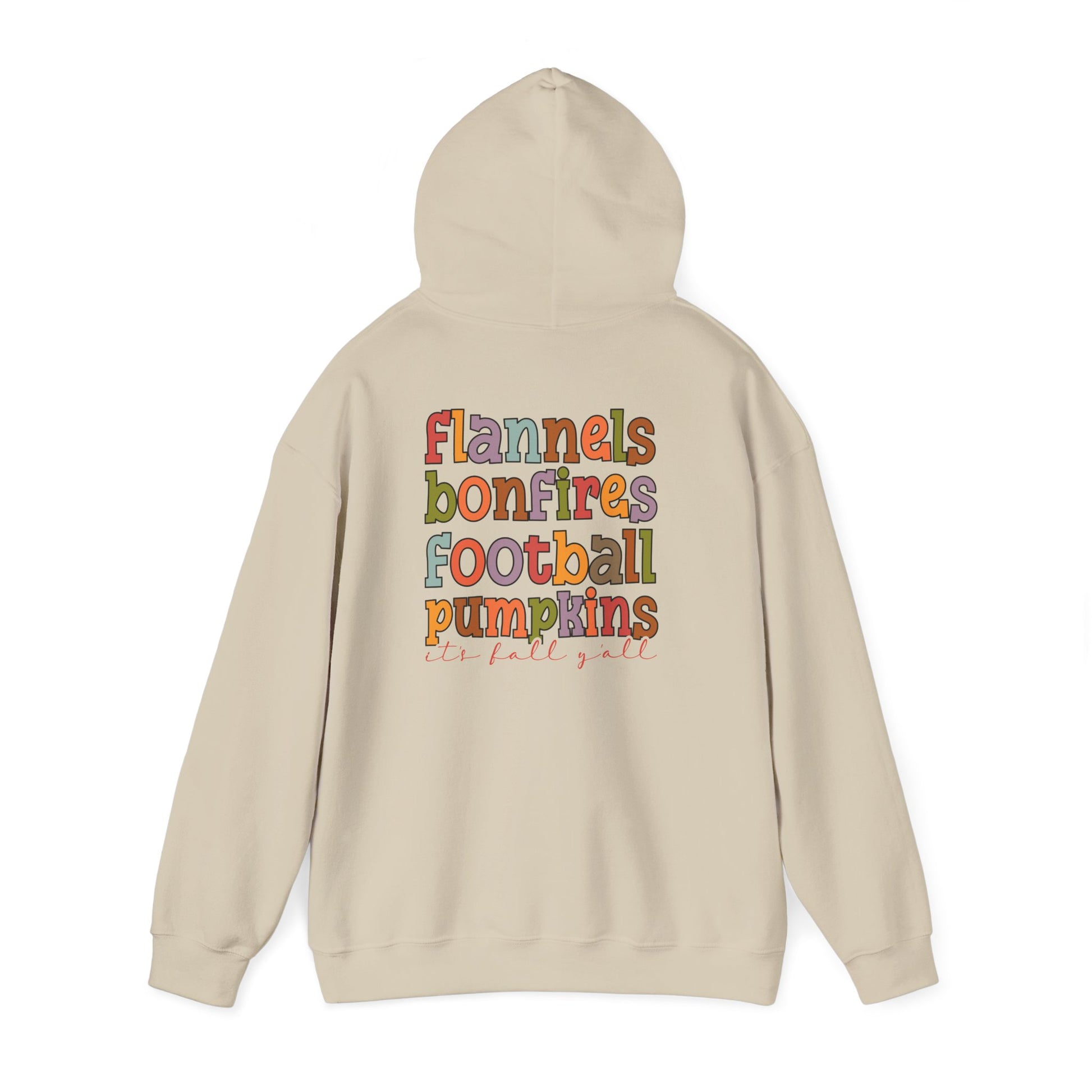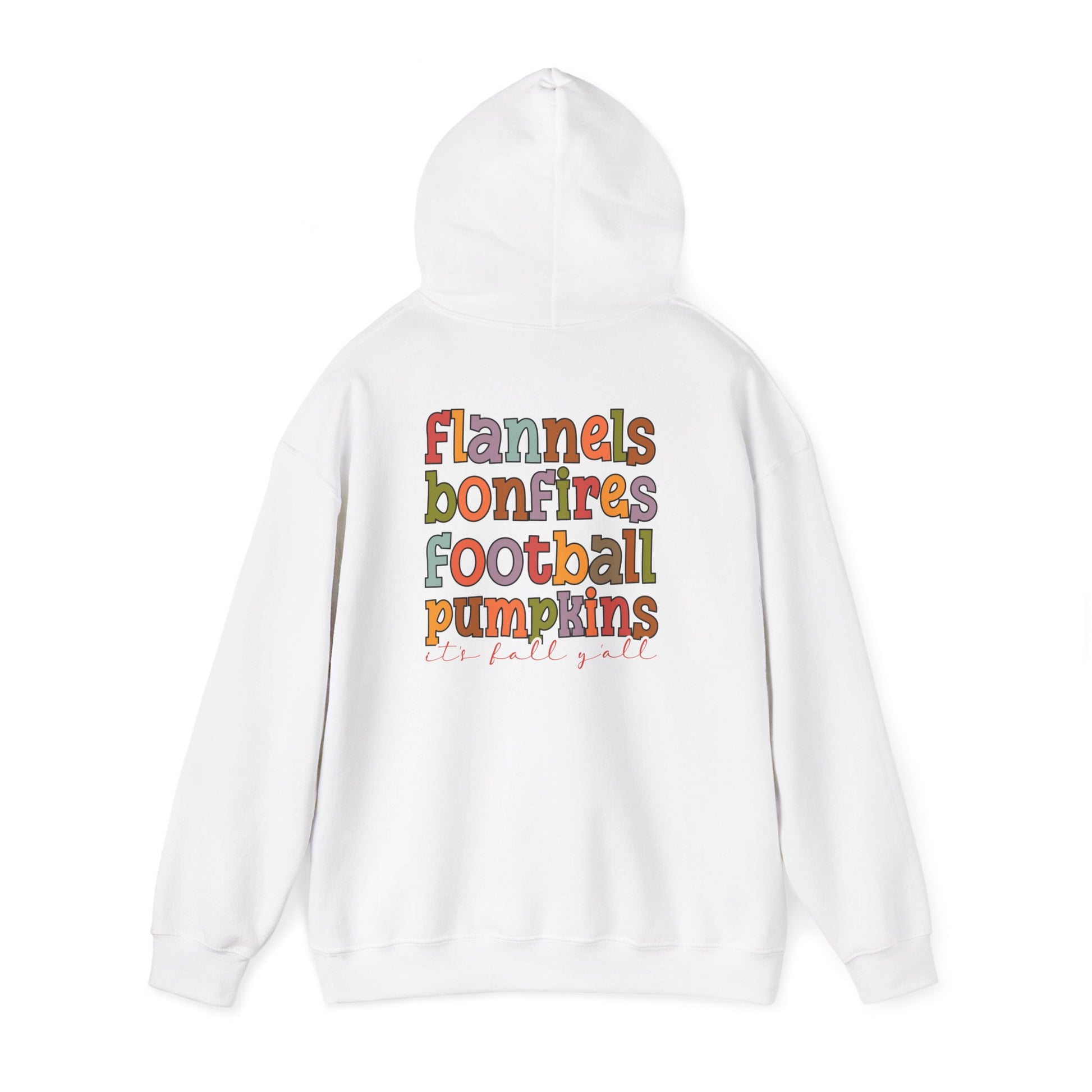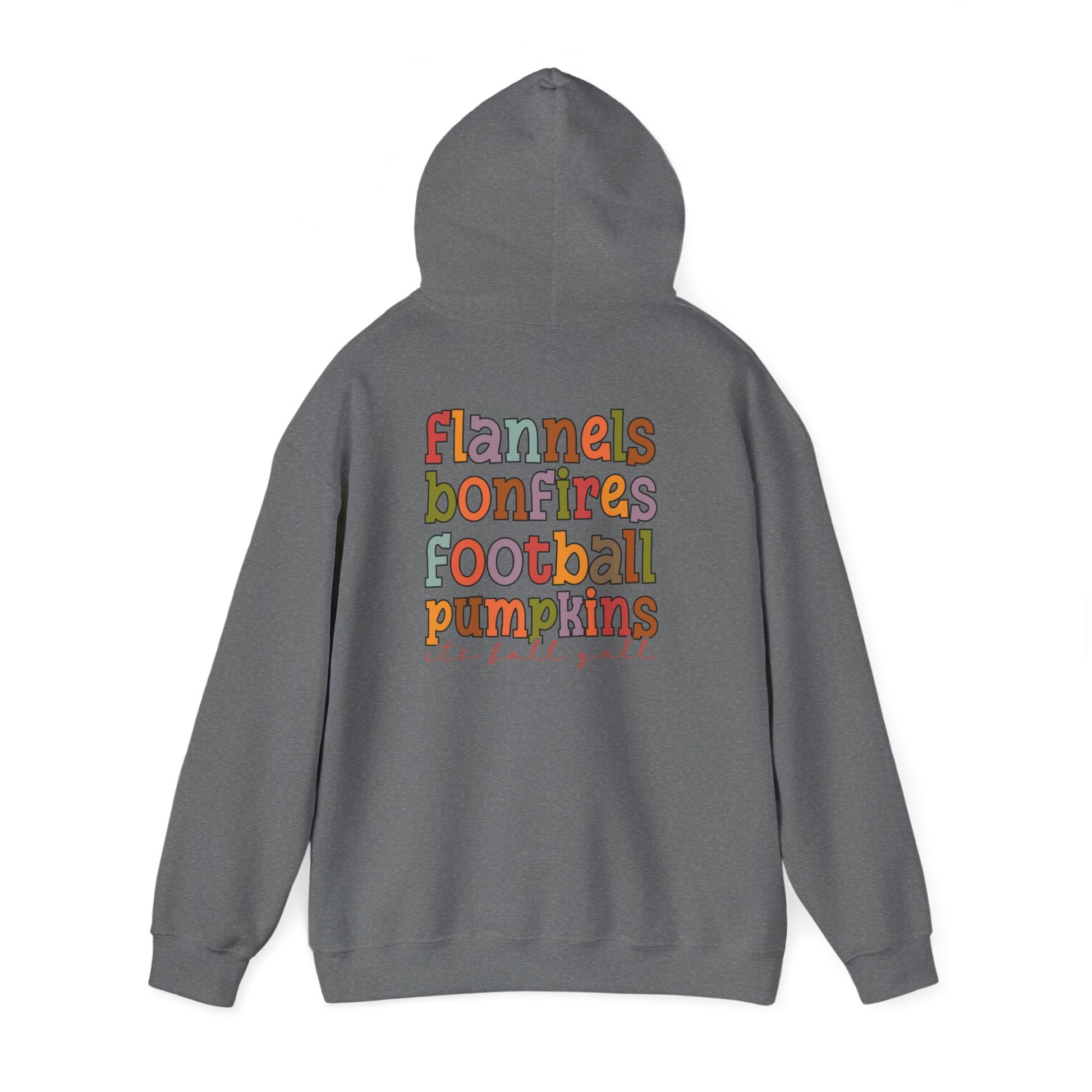 Embrace the cozy charm of fall with this Unisex Heavy Blend™ Hooded Sweatshirt. Designed for comfort, it features a spacious kangaroo pouch to keep your hands warm and a stylish drawstring hood that adjusts to your perfect fit. The unique, eye-catching print celebrates the joys of autumn with playful words like "Flannels," "Bonfires," "Football," and "Pumpkins," making it ideal for seasonal gatherings and cozy nights in. Whether you're hosting a fall party or enjoying a quiet evening by the fire, this sweatshirt is a perfect addition to your wardrobe. It's suitable for men and women alike, and makes an awesome gift for friends and family during holidays, celebrations, or just to brighten their day!