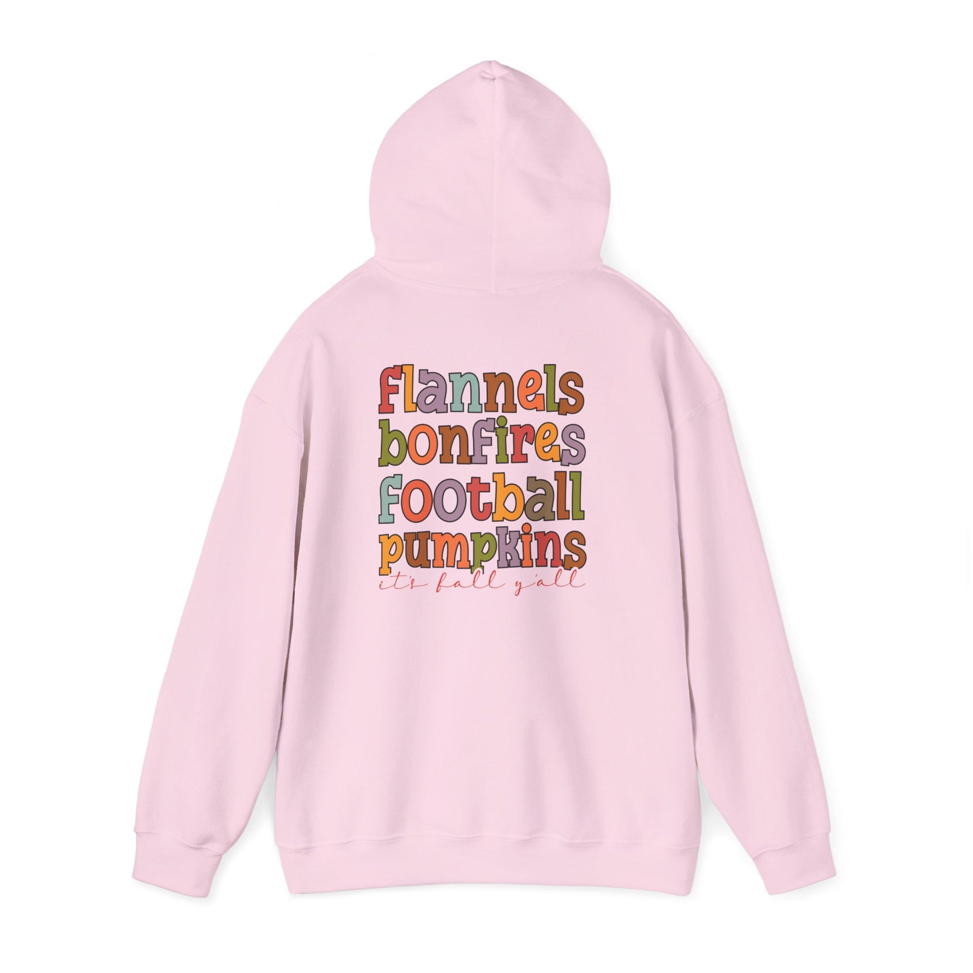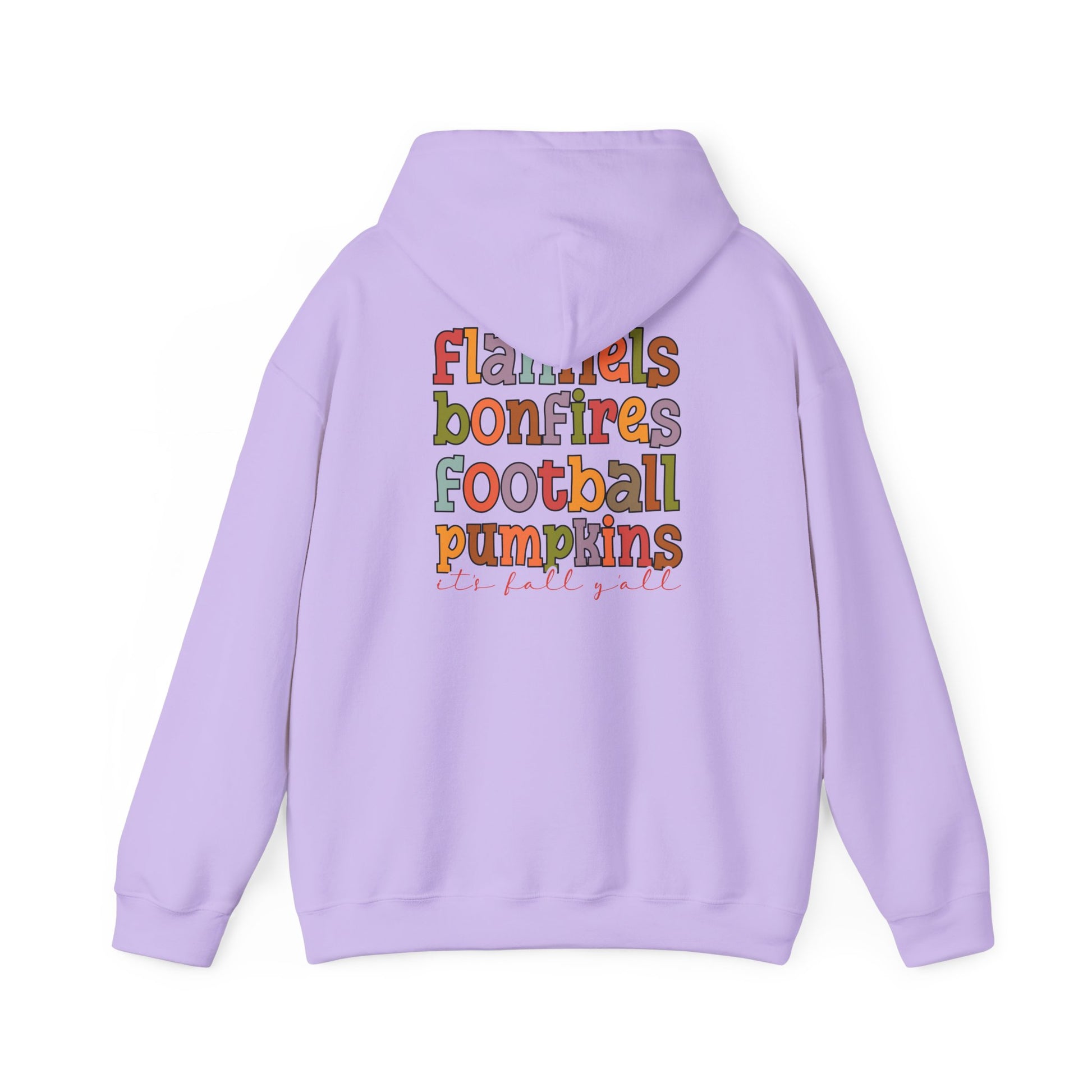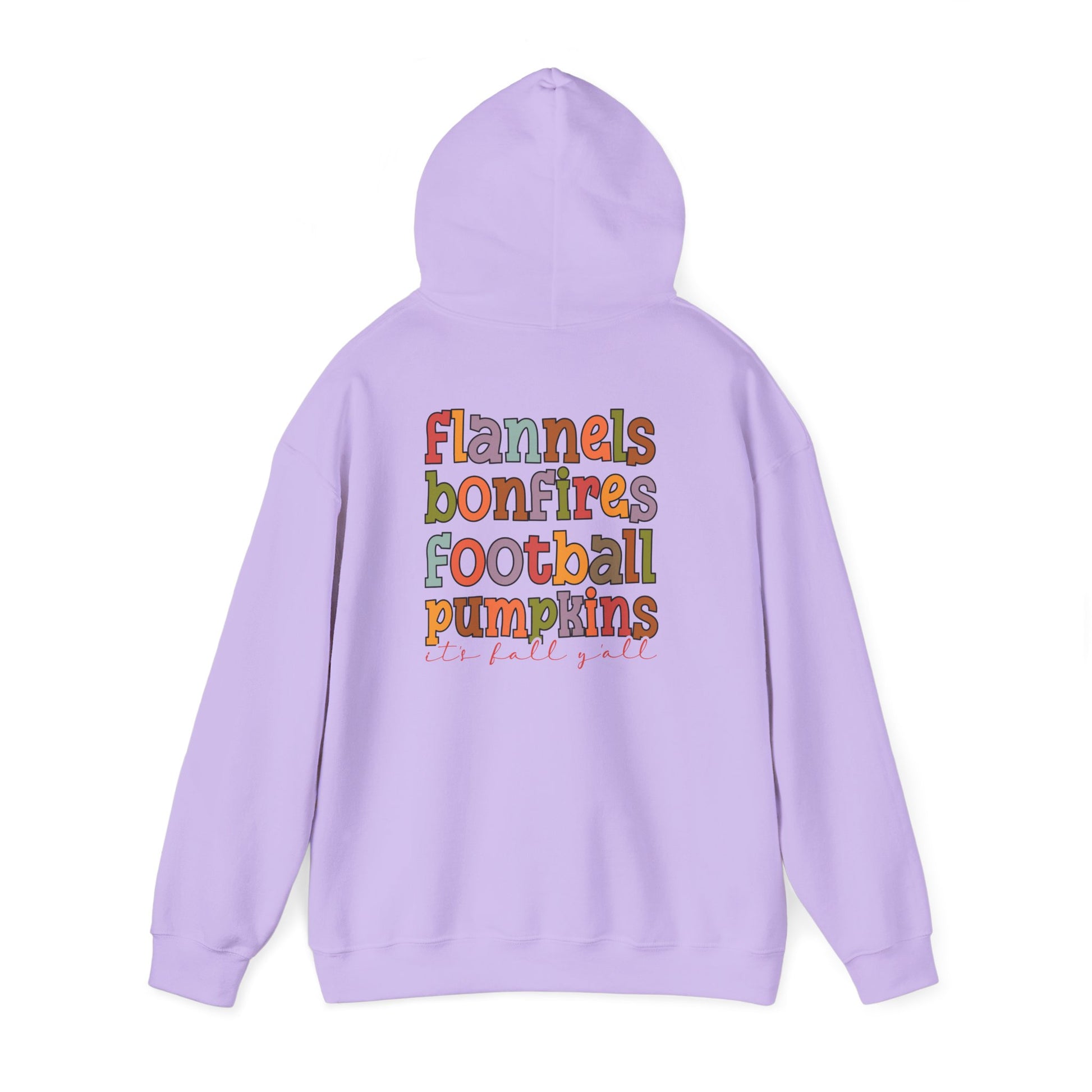 Embrace the cozy charm of fall with this Unisex Heavy Blend™ Hooded Sweatshirt. Designed for comfort, it features a spacious kangaroo pouch to keep your hands warm and a stylish drawstring hood that adjusts to your perfect fit. The unique, eye-catching print celebrates the joys of autumn with playful words like "Flannels," "Bonfires," "Football," and "Pumpkins," making it ideal for seasonal gatherings and cozy nights in. Whether you're hosting a fall party or enjoying a quiet evening by the fire, this sweatshirt is a perfect addition to your wardrobe. It's suitable for men and women alike, and makes an awesome gift for friends and family during holidays, celebrations, or just to brighten their day!