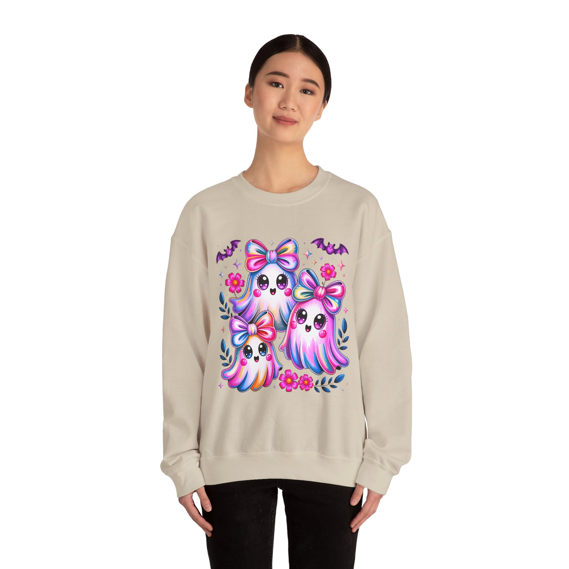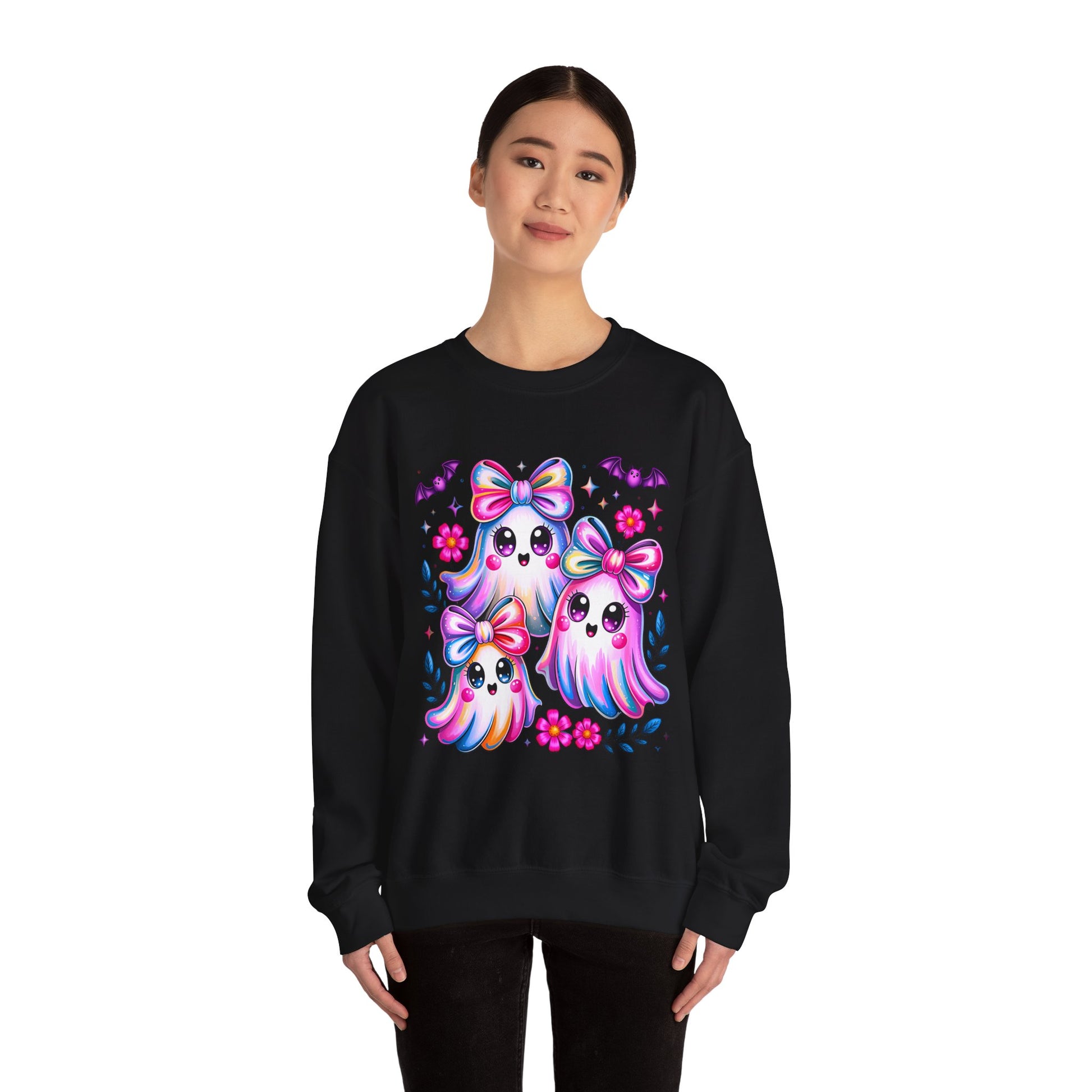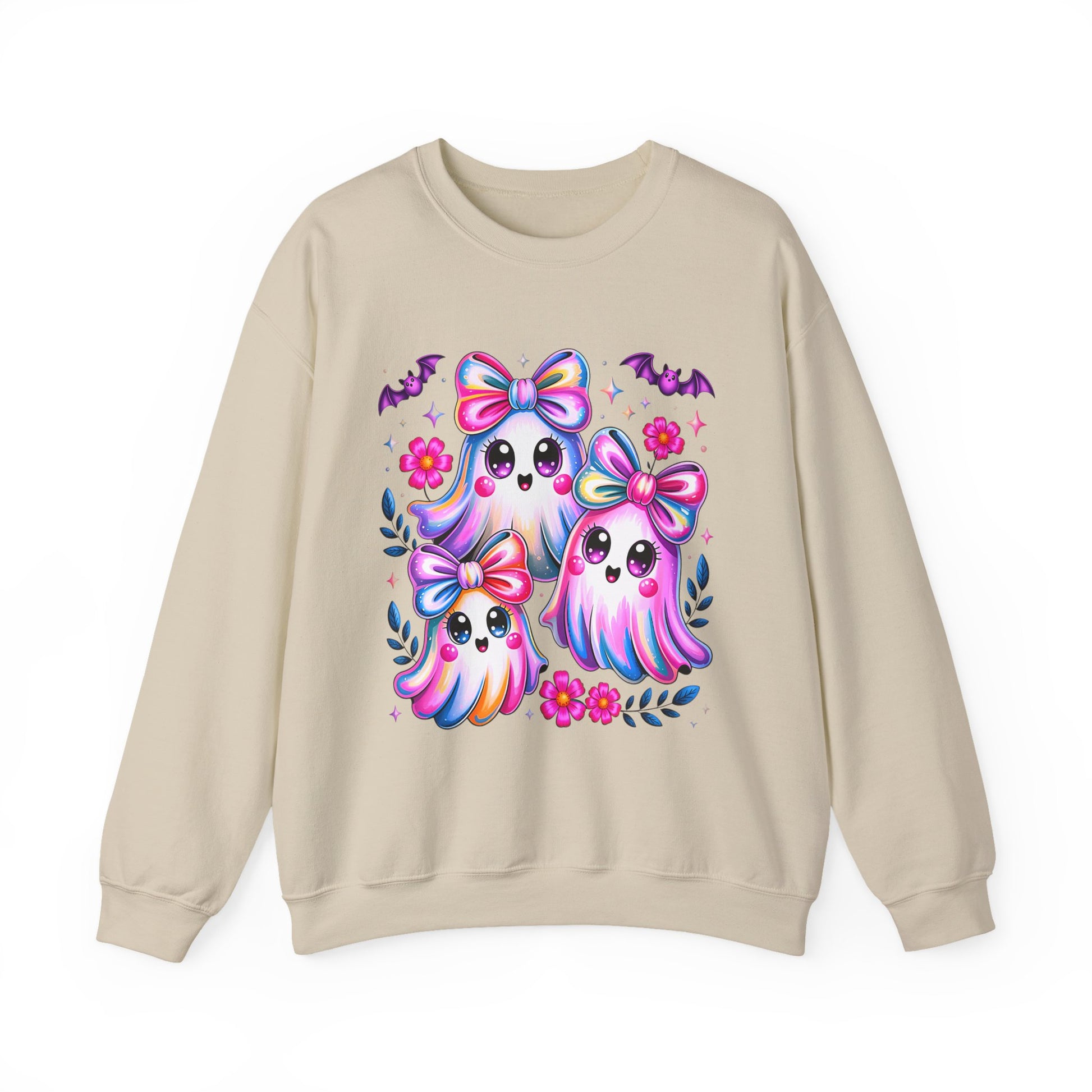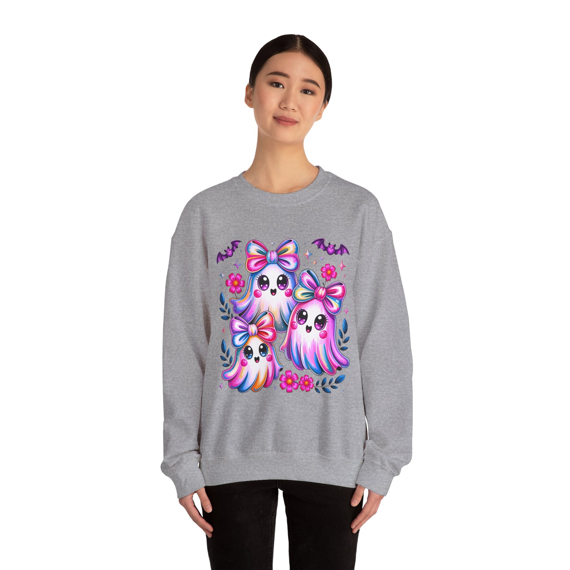 Celebrate spooky season in style with this charming Crewneck Sweatshirt, featuring adorable ghost designs adorned with colorful bows and flowers. The playful vibe brings a sense of joy and whimsy, making it perfect for cozy evenings at home or fun Halloween gatherings with friends. This sweatshirt is tailored for adults who want to express their unique flair during festive occasions or simply add a touch of fun to their everyday outfits. Ideal for Halloween, fall festivals, or as a quirky gift for ghost enthusiasts, it easily fits into any casual wardrobe while promising comfort and warmth during the chillier months.