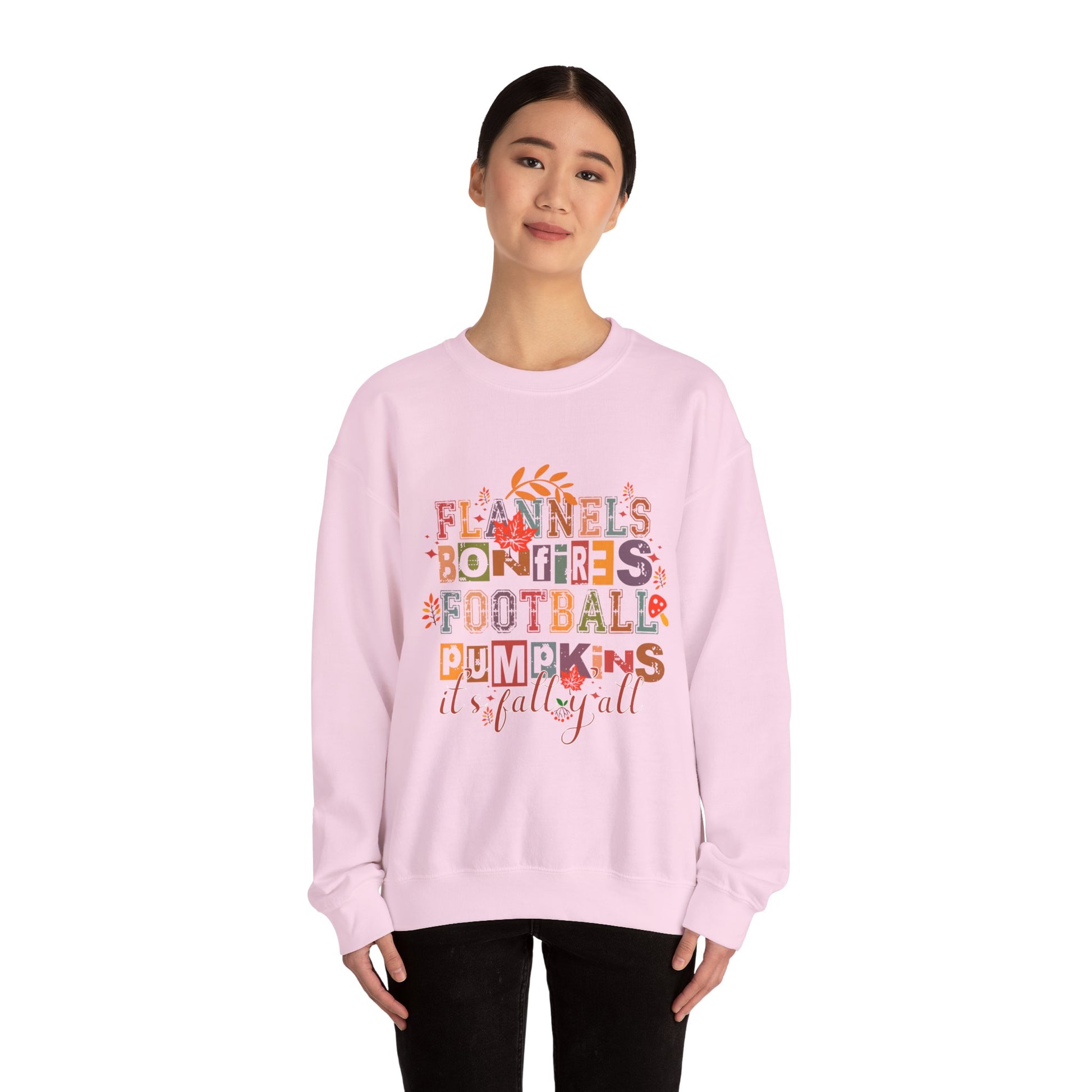 Introducing a cozy Unisex Heavy Blend™ Crewneck Sweatshirt, perfect for those crisp autumn days. The charming design captures the essence of fall with playful phrases about flannels, bonfires, football, and pumpkins, making it a delightful addition to your seasonal wardrobe. Feel the warmth and snug comfort of its medium-heavy fabric blend, as you enjoy outdoor gatherings or cozy nights in. This sweatshirt is not just clothing; it's a mood, evoking a sense of nostalgia and celebration during the harvest season. Ideal for anyone who revels in fall festivities, from Halloween to Thanksgiving, or simply appreciates the beauty of changing leaves. Throw it on for a casual day out, or layer it for a night of festivities, and bring the cozy vibes with you wherever you go!